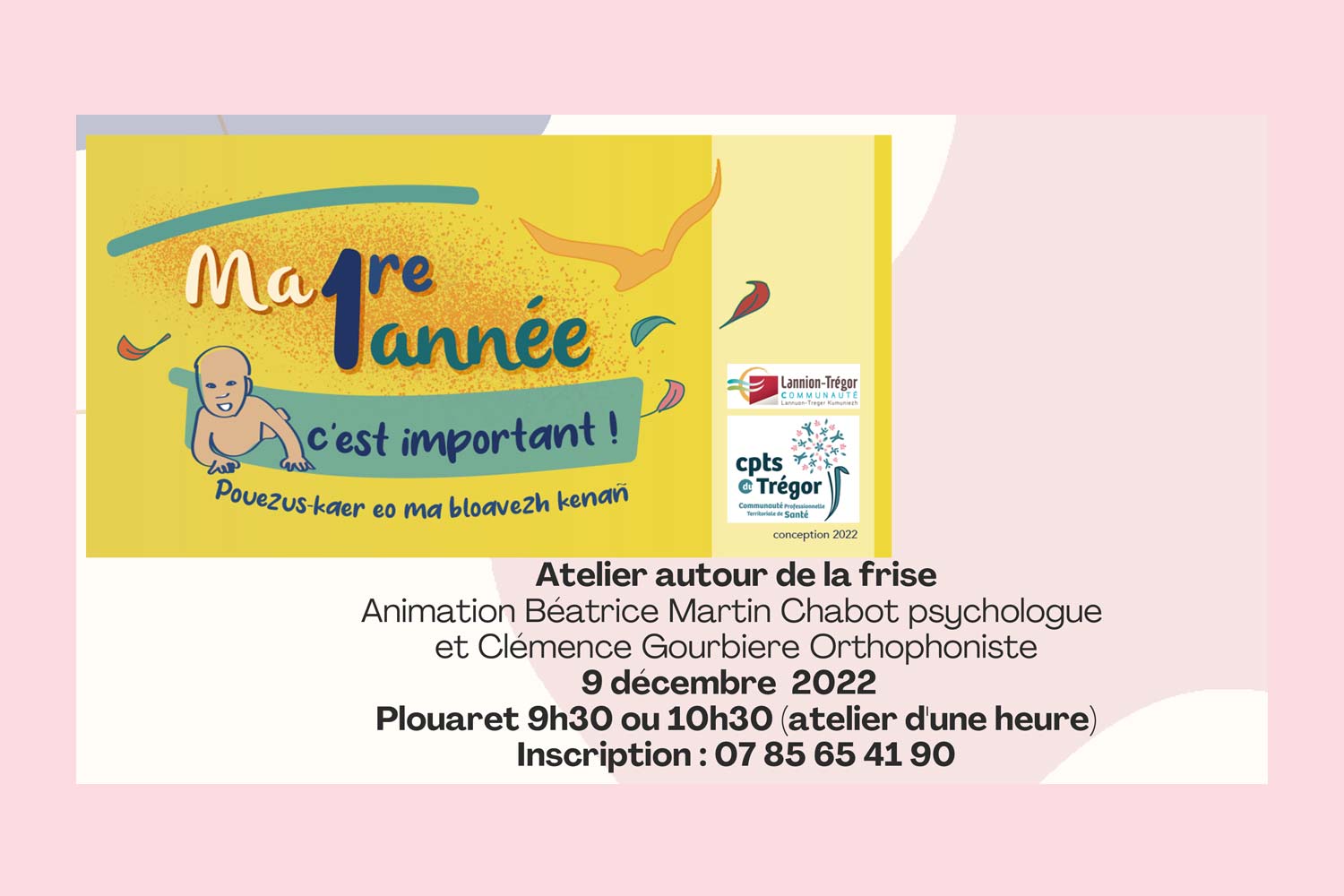 Vendredi 9 décembre 2022Plouaret 9h30 ou 10h30 (atelier d’une heure)Inscription : 07 85 65 41 90
