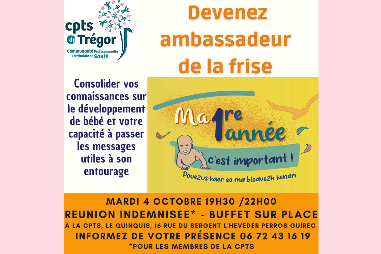 Vous voulez approfondir vos connaissances pour vous sentir plus à l’aise pour présenter la frise aux parents, à l’entourage de bébé et aux professionnels de la petite enfance. Vous disposez de compétences spécifiques (techniques de massage, portage, jeux pour éviter les écrans, recette de cuisine…) venez les partager pour enrichir nos pratiques et constituer un binôme d’ambassadeurs/ambassadrices de la frise.